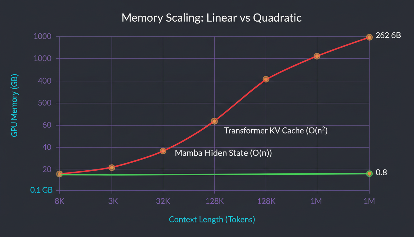 Key insight: Mamba's memory is constant in context length. It doesn't matter if you have 8K or 1M tokens—same memory footprint.